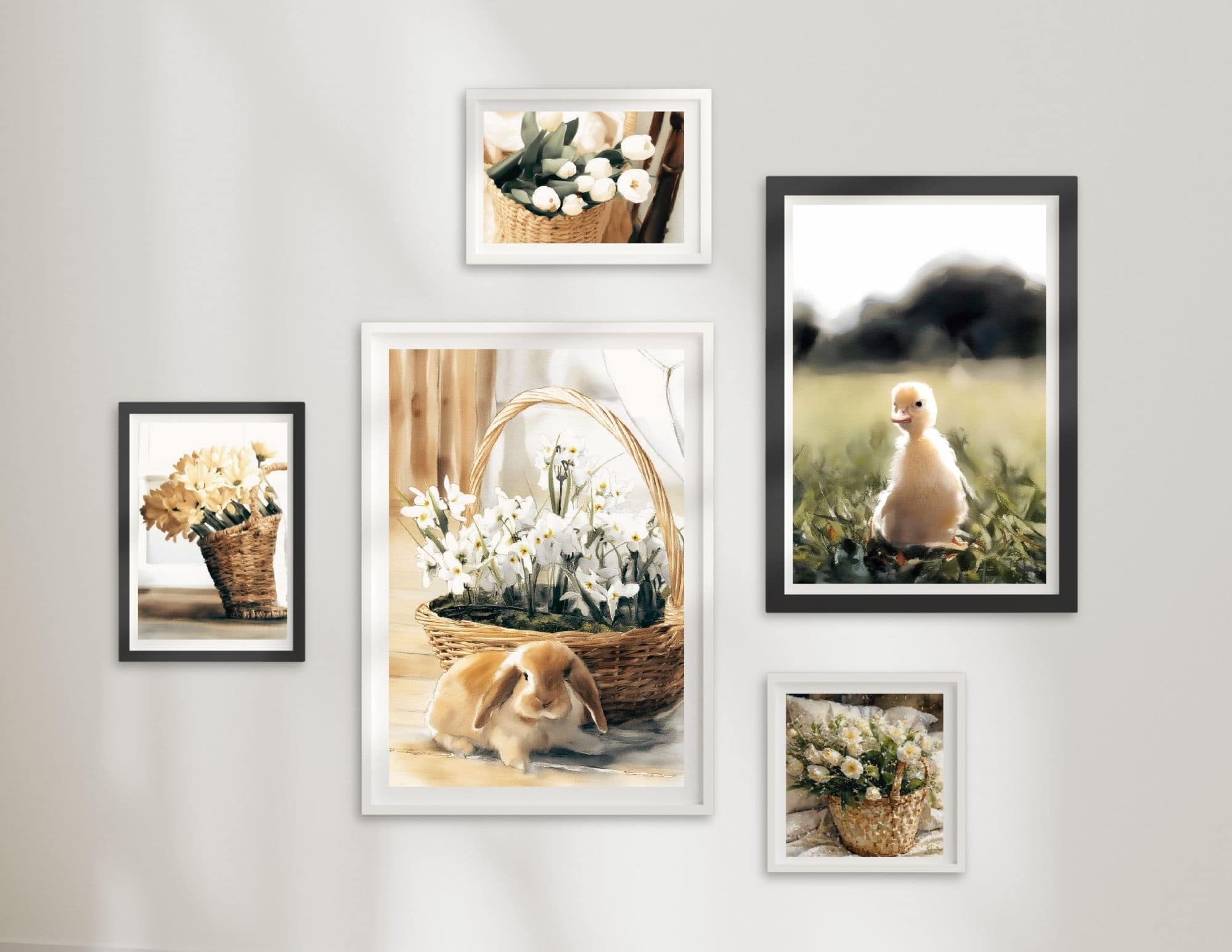 A soft and charming set of Spring Flowers and Animals Wall Art, featuring delicate watercolor illustrations of blooming flowers in baskets, a sweet baby chick, and a gentle bunny. Designed to bring a light, peaceful feel to your space, this set adds a subtle touch of spring without feeling overwhelming.